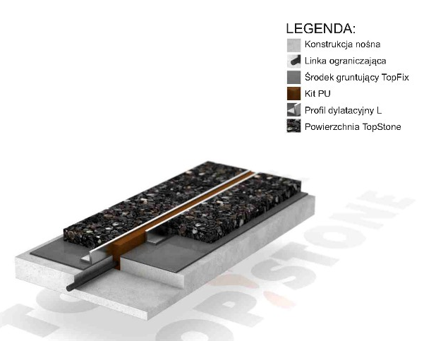 Zaletą dylatacji jest mniejsza powierzchnia do realizacji bez przerwy technologicznej. w przypadku układania powierzchni TopStone na jednolitym podłożu bez dylacji należy, zwłaszcza w przypadku świeżych ( 5-28 dni od betonowania) betonów, należy wykonać dylację podłoża.